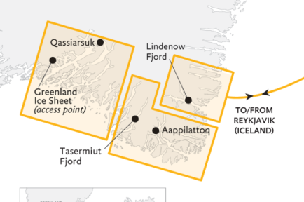 我们将深入东岸荒原峡湾,其中之一是林登诺夫峡湾(格陵兰语称“康格鲁斯瓦克”)。数千年前,古因纽特猎人与渔民已在此与世隔绝的峡湾中安居,依靠海洋资源生存——远早于欧洲探险家的到来及后续移民潮推动的大规模定居。如今,在奔泻的冰川与陡峭山峦的背景下,仍可寻得早期居民的痕迹。峡湾是观察野生动物的绝佳地点,尤其是海洋哺乳动物。偶尔可能有北极熊随东格陵兰洋流的海冰从北方漂流而至。进入峡湾时,浅海区域养分上涌,常能见到座头鲸的身影。在寻觅野生动物的同时,壮丽的高山地貌也吸引着我们通过海、陆、空多种方式深入探索,沉浸于这片偏远冰境。“野性东岸”是直升机降落、皮划艇、徒步、冲锋艇巡航及岸上登陆的理想之地。