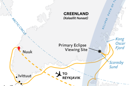 这条更长的航线总航程达2200海里,不仅包含您梦寐以求的日全食观测体验,还留有时间探索格陵兰东北部和南部。此外,您还将一次到访两座世界最北的首都城市:冰岛首都雷克雅未克(北纬64°08′)——我们将在那里留出时间供您探索,以及格陵兰首府努克(北纬64°11′)——我们将在那里下船,搭乘包机返回雷克雅未克。