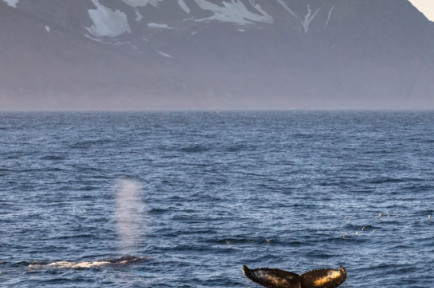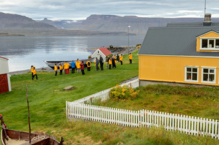 我们将用一整天时间,通过橡皮艇巡航、船上观测,以及在条件允许时由向导带领登陆岸上来探索这片土地。这里的景致丰富多样:险峻的悬崖、奔涌的瀑布、色彩斑斓的沙滩、连绵的绿丘、点缀着岩石露头和微型湖泊的高地荒原。您很可能看到冰岛马和长毛绵羊在山坡上悠然吃草。峡湾边缘及丹麦海峡沿岸零星散落着几处小渔村,是这里为数不多的人类文明据点。